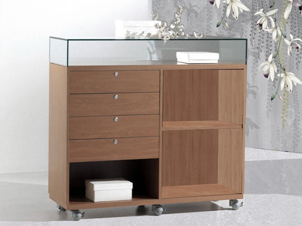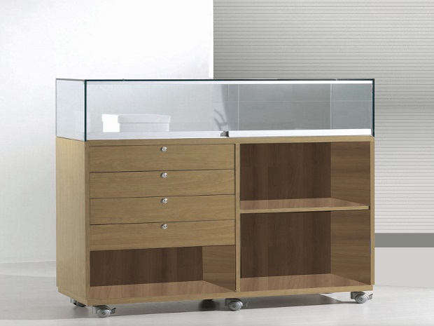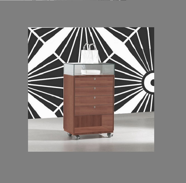 Mostrador vitrina de 15cm de alto con ruedas para su facil manejo, 4 cajones.