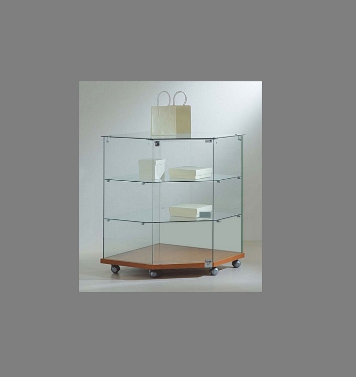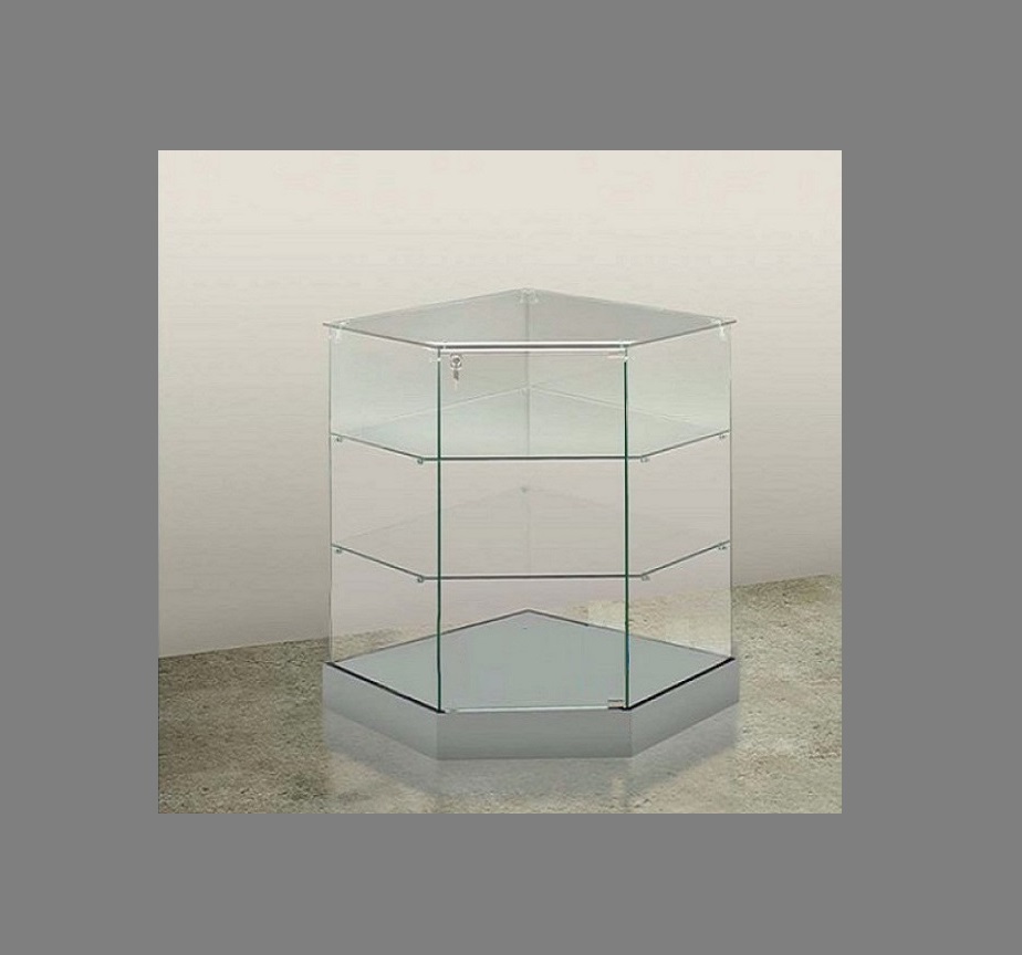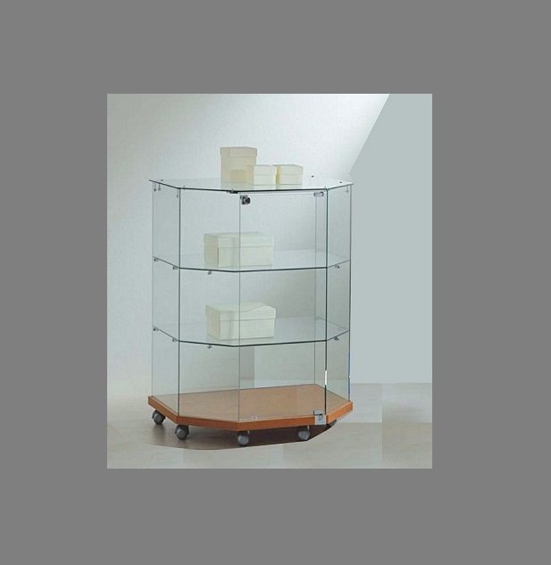 MOSTRADOR VITRINA TRAPEZOIDALPUERTA ABATIBLE 2 ENTREPAÑOS DE CRISTAL FDM28