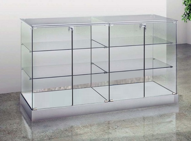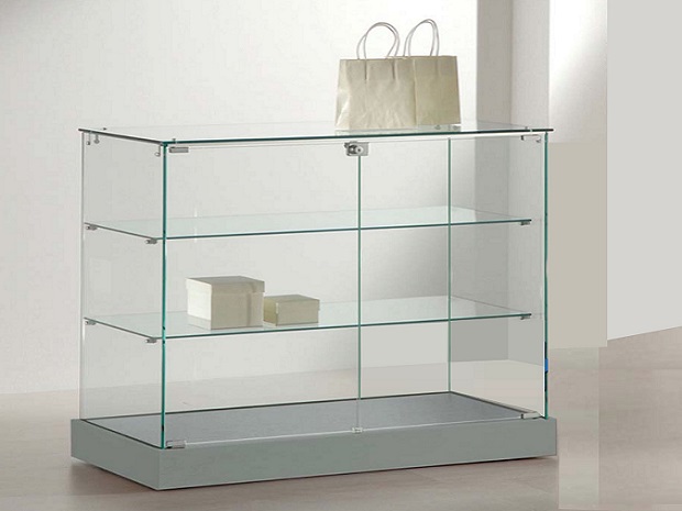 Mostrador vitrina puerta abatible 2 entrepaños de cristal vidrio templado.