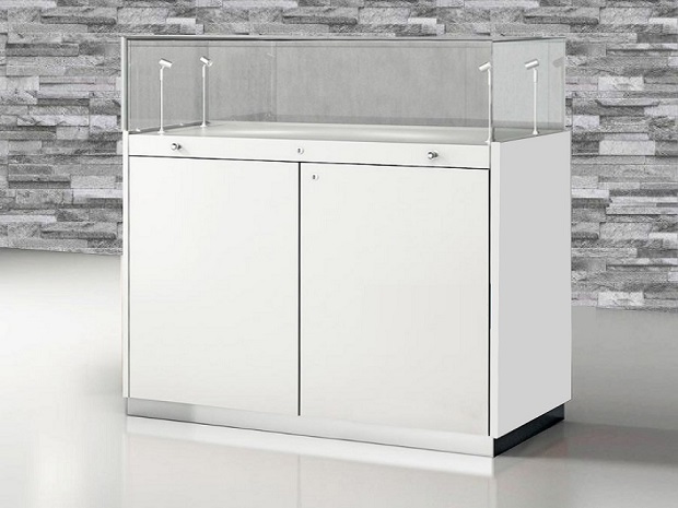 Mostrador vitrina cerradura 2 entrepaños de cristal puerta abatible.