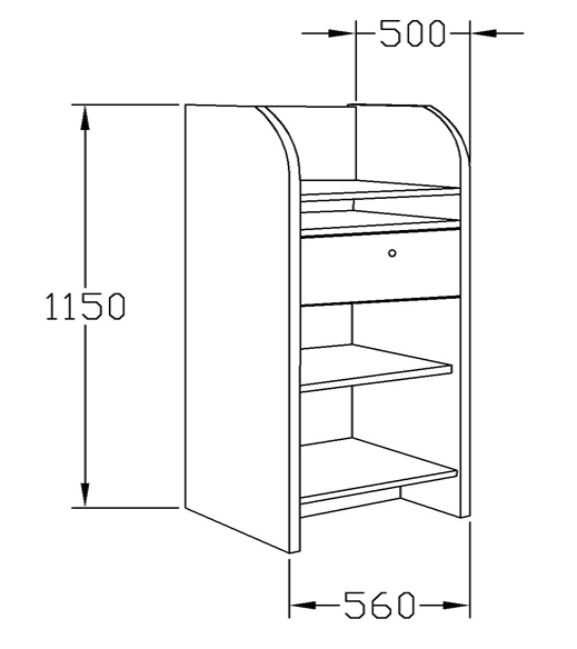 Mostrador tipo caja alta FDM19 Mostradores para tiendas. Mostrador dado orejero. Cubierta de madera. Costados de 30 m/m. Costados curvados. Bandeja extraíble para el teclado. 1 Cajón con correderas de cierre suave 1 Estante Jaladera a elegir Niveladores Color y material a elegir.