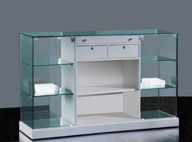 Mostrador vitrina expositora de cristal con 2 vitrinas laterales. Medidas totales del mostrador: 900 H x 1830 A x 460 F m/m. Descripción del cuerpo central modelo Cristal 162 MG Medidas: 900 H x 880 X 460 F m/m. Sobre de cristal. Bandeja extraíble para la exposición (ver detalle). Zócalo de madera lacado de 100 m/m de altura con ruedas. El interior incorpora 2 cajones con cerradura. 1 Estante graduable de madera. Descripción de las 2 vitrinas laterales de cristal modelo Cristal 10 AC Medidas de las vitrinas: 900 H x 515 A x 460 F m/m. Zócalo de madera lacado de 100 m/m de altura con ruedas. Sobre de cristal. 2 Estantes de cristal. Puertas abatibles de cristal con cerradura. Cristales laminado. Opcional Estantes graduables Sustitución de las ruedas por pies graduables Iluminación 1 ó 2 laterales mediante focos halógenos o de leds. Color y material a elegir.