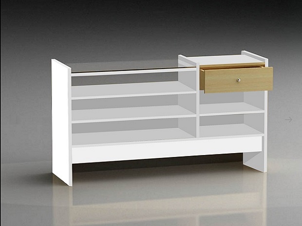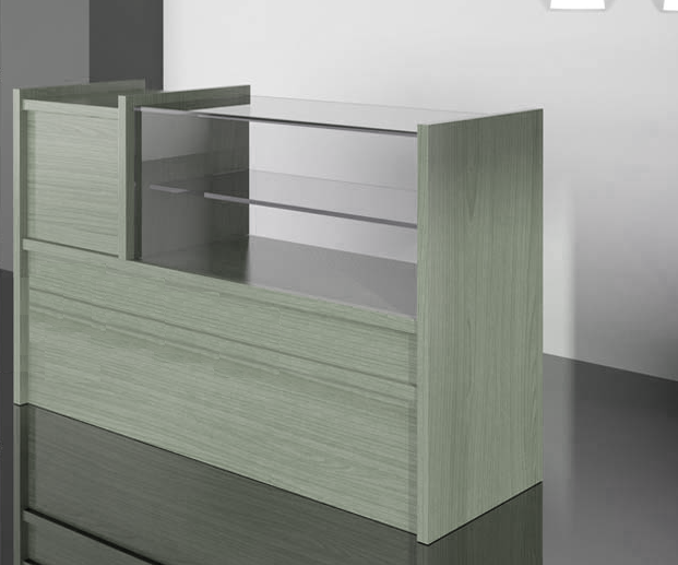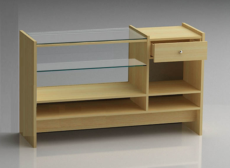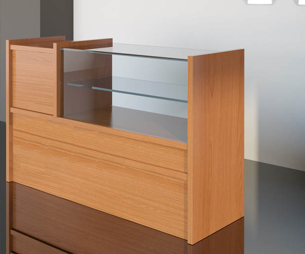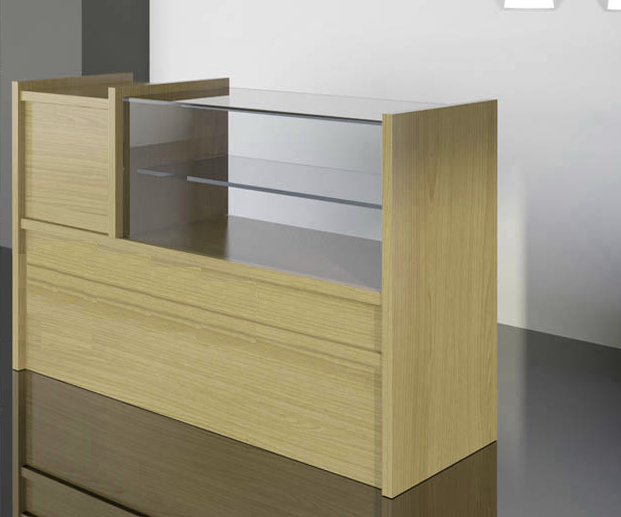 Mostrador vitrina exhibidora FDM03 Mostradores para tiendas. Mostrador vitrina punto de venta Vitrina de 200 m/m. de altura. Ancho de la caja de 455 m/m. cubierta de cristal de 8 m/m. Frontal de cristal de 6 m/m. Costados de 30 m/m. 1 Cajón con correderas de cierre suave. 2 Estantes. Niveladores Jaladera a elegir Colores y materiales a elegir.