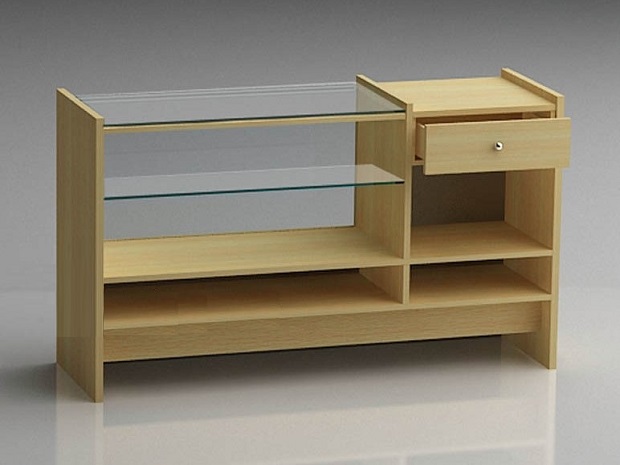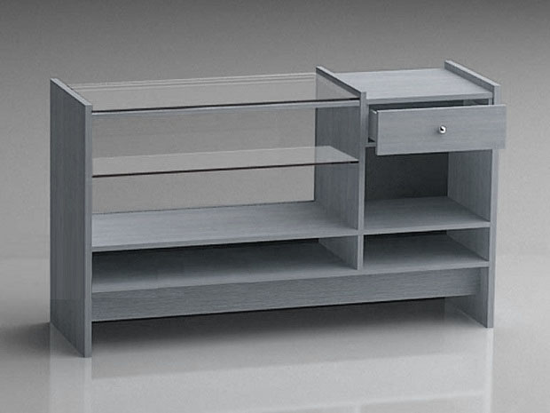 Mostrador de vitrina y mostrador caja FDM06 Mostradores de tiendas y comercios. Mostrador media vitrina de cristal con caja. Vitrina de 380 m/m. de altura. Ancho de la caja de 455 m/m. Cubierta de cristal de 8 m/m. Frontal de cristal de 6 m/m. 1 Entrepaño de cristal de 300 m/m. Costados de 30 m/m. 1 Cajón con correderas de cierre suave. 1 Entrepaño de madera. Jaladeras a elegir Niveladores Colores y materiales a elegir.